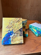 当店のレトルトカレーは、絵画になっています。日本画で表現した鬼子母神堂とそこに暮らす猫をモチーフとて、絵具にはユルカレーにも使用しているターメリックとコリアンダーのスパイスを取り入れてもらいました。